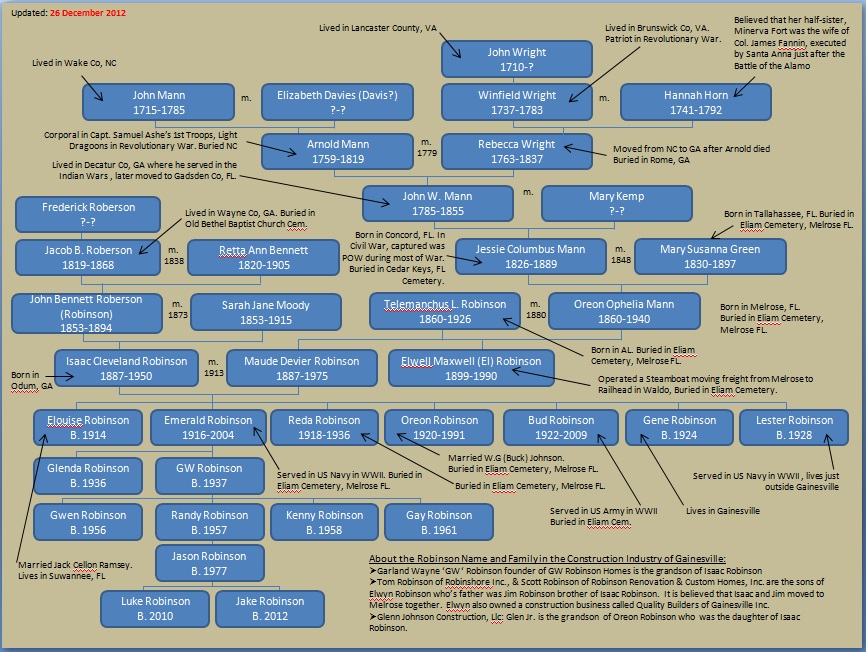 The Old Bethel Baptist Church in Wayne County Georgia Maude Devier Robinson was the daughter of Telemanchus Robinson and Oreon Mann. Oreon's father was Jessie Mann who served in the Civil War and was buried in 1889 in the Cedar Keys. Jessie's father was John Mann who lived in Decatur County Georgia, John Mann served in the Army during the Indian Wars. John's father was Arnold Mann, Arnold was a patriot in the Revolutionary War, he served as a Corporal in Captain Samuel Ashe's 1st Troops, Light Dragoons. Arnold is buried in North Carolina. Corporal Mann's Service Documents from the Revolutionary War. The Robinson story in the local area began with Issac 'Cleve' Robinson opening a small grocery store in downtown Gainesville in 1928, (pictured below). Cleve's son, Emerald Robinson, started working in this store in 1935. Today, stands a building known for many years as 'Market Street Pub' on the original site with a mural which still bears the name 'ROBINSON'S MARKET, FRESH MEATS & VEGETABLES 120 S.W. 1st AVE'. Emerald eventually opened his own grocery store and operated it through the 1970s; he also helped his son, Garland Wayne Robinson (known as "GW') open a grocery store called 'Wayne's Grocery' in old downtown Gainesville. The Open Air Market, Cleve Robinson on the right ![]() Modern Downtown Building with 'ROBINSON'S MARKET' Mural GW Robinson married Kate Marie McCullars in 1955 and had four children, Gwen, Randy, Kenny and Gay. Kate is the daughter of Arthur Lane McCulllars and Kate Marie Highsmith McCullars. Lane McCullars built homes in the construction industry in Gainesville and was instrumental in getting GW started in building. GW sold the grocery business and went into the construction business in 1968, 'G.W. Robinson Builder & Developer' now known as "GW Robinson Homes'. GW's son, Randy Robinson, worked with his father from the beginning through the 1990's until beginning his own construction business, "R.E. Robinson Remodeling and Custom homes'.